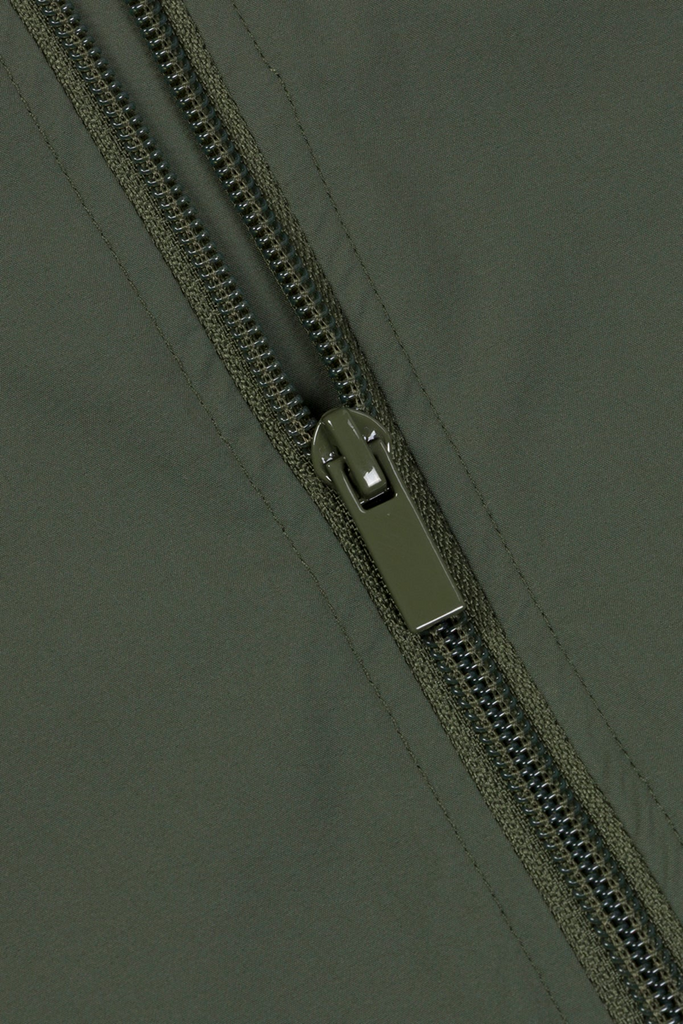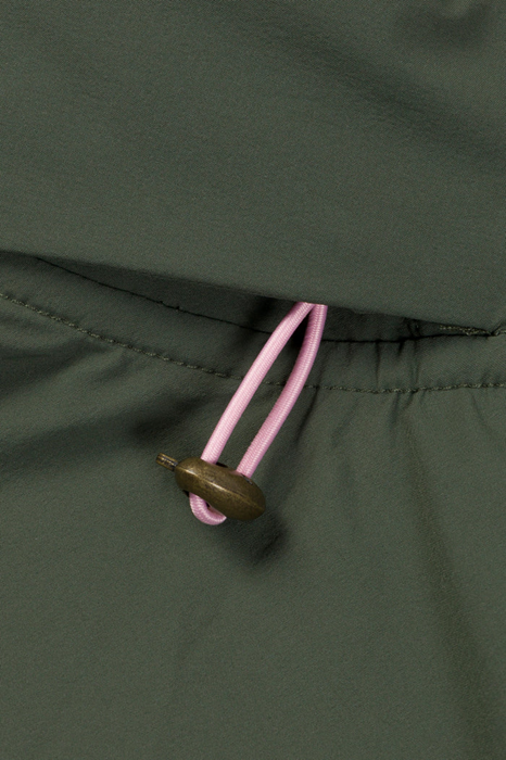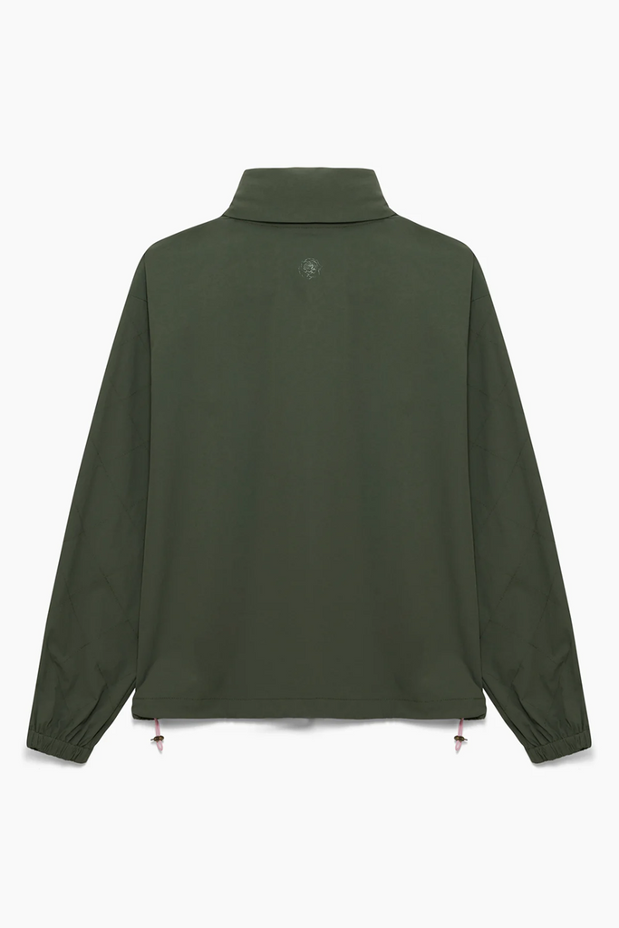 Sleek bomber-inspired fit with lightweight structure. Fold-away hood snaps into a padded collar, quilted sleeves add subtle detailing, and signature pink bungees finish it off with a functional and stylish edge. Secure zip pockets keep your essentials in place.