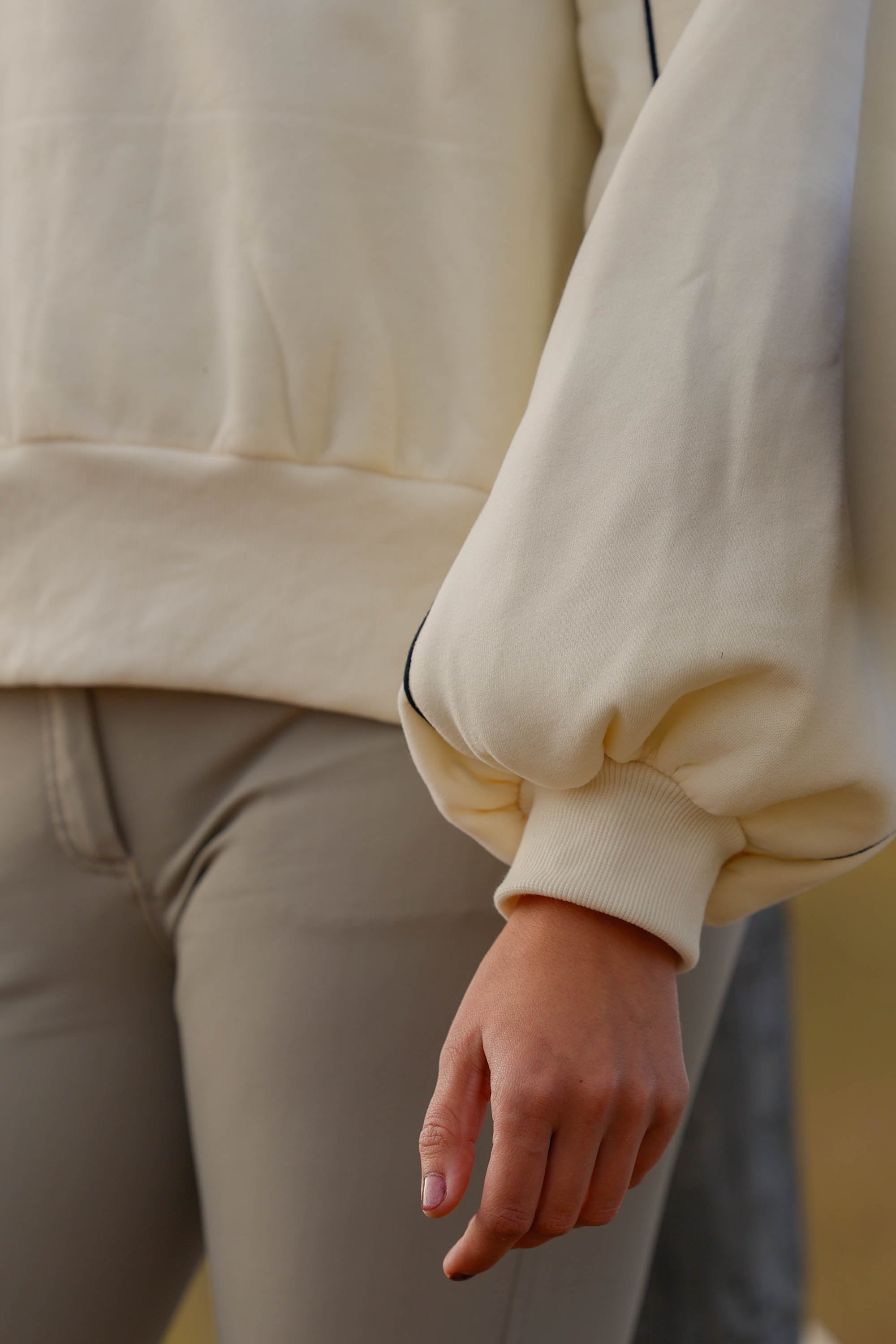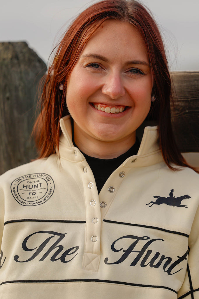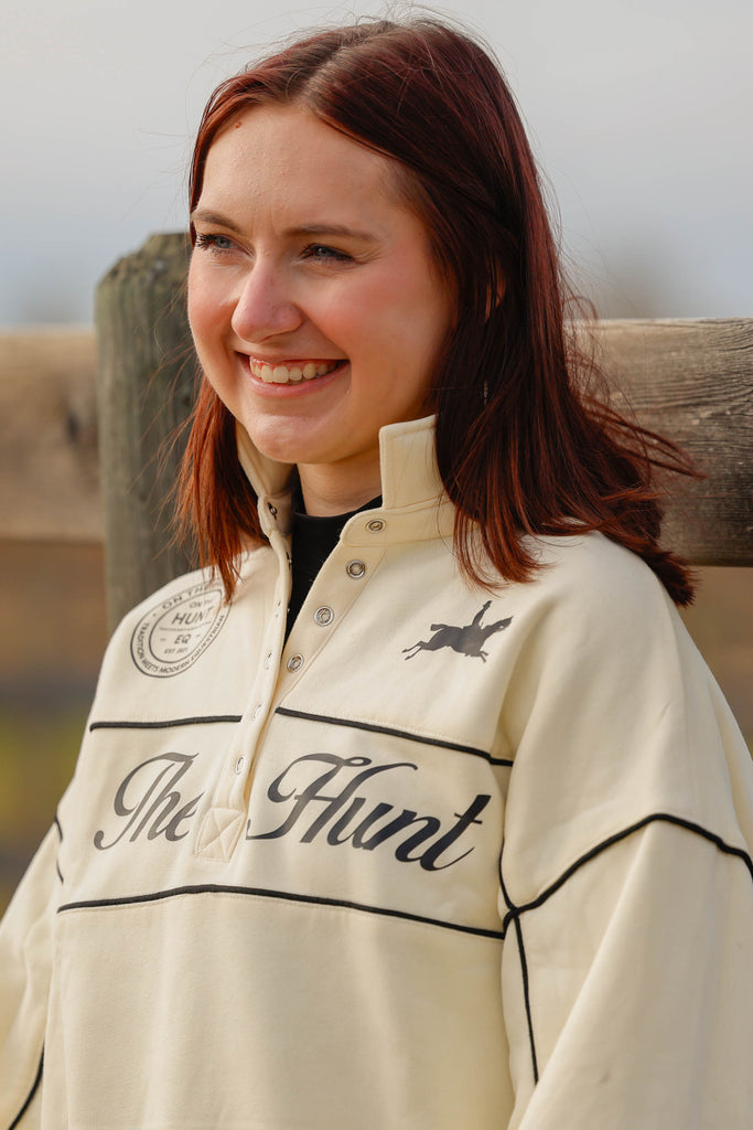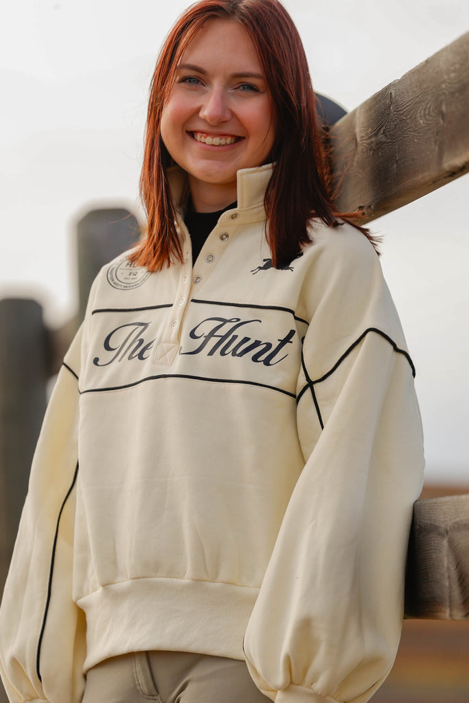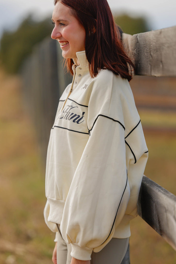 This relaxed-fit pullover features contrast piping that adds a tailored edge to its soft, creamy base, while the puff sleeves bring a subtle nod to Anne of Green Gables—romantic, feminine, and a little bit nostalgic. The snap-button collar gives it that sporty-meets-sophisticated vibe, perfect for layering over your favorite show shirt or pairing with breeches for a polished barn-to-town look.