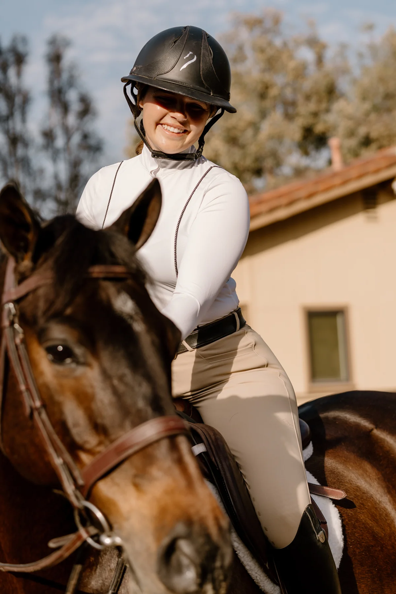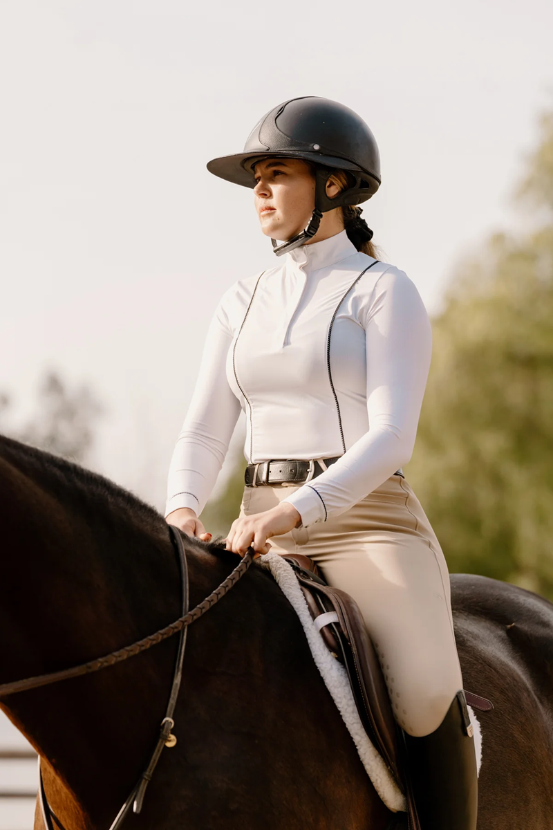 A modern take on timeless elegance. Constance pairs structure with softness for a refined, competition-ready silhouette. Delicate black scalloped lace along the princess lines and cuffs adds just the right amount of detail, quietly bold and effortlessly polished.