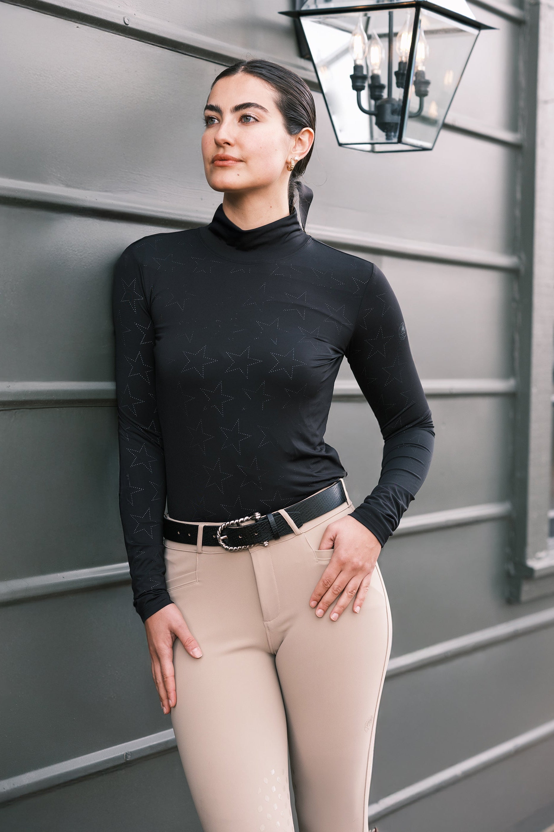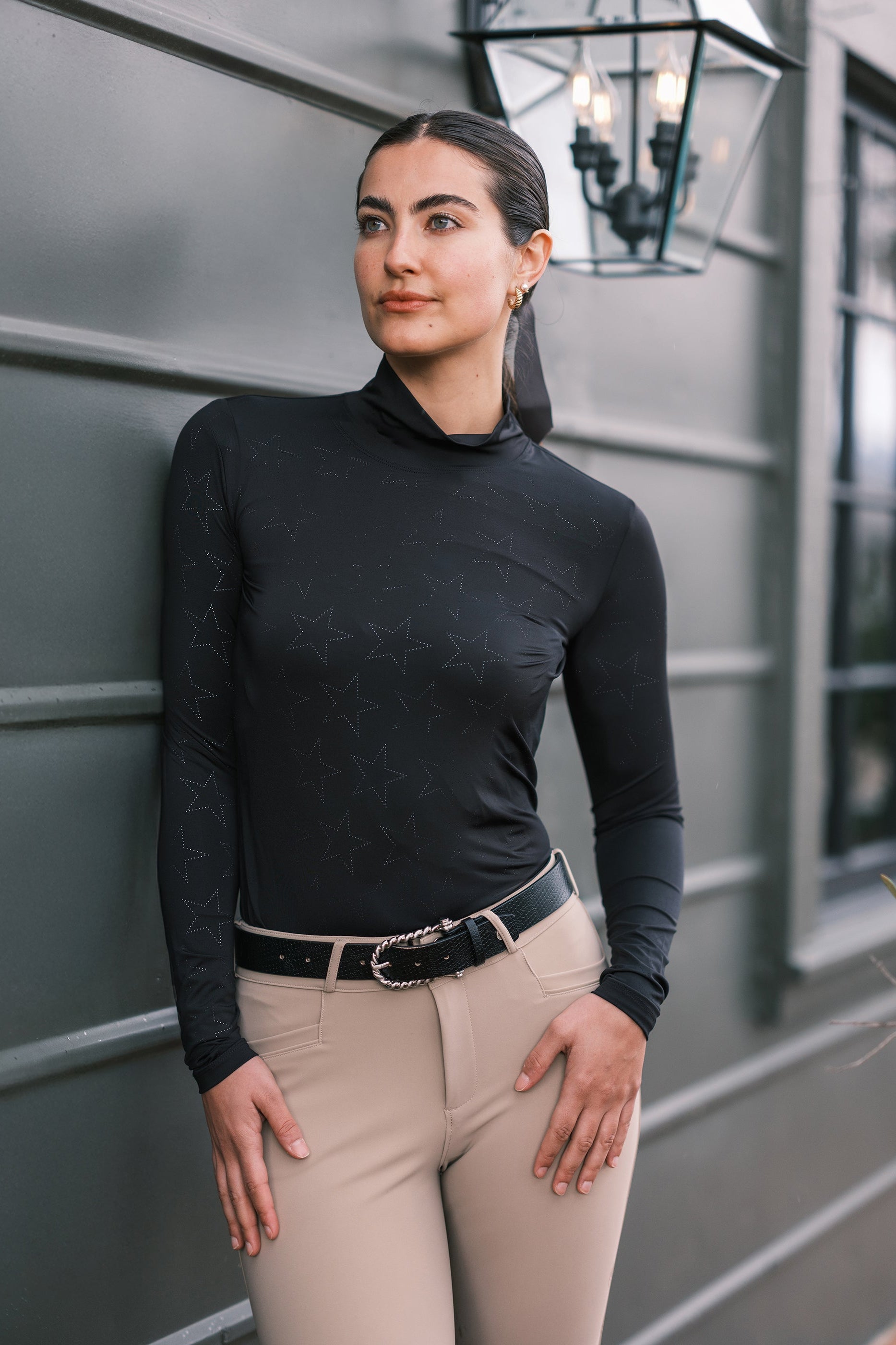 Cue the spotlight. The Farrah Star Turtleneck is made for those who lead with quiet power. Designed in a buttery-soft technical knit with an all-over perforated star pattern, she’s breathable, stretchy, and just the right amount of bold. Functional for movement, fabulous for everything else.