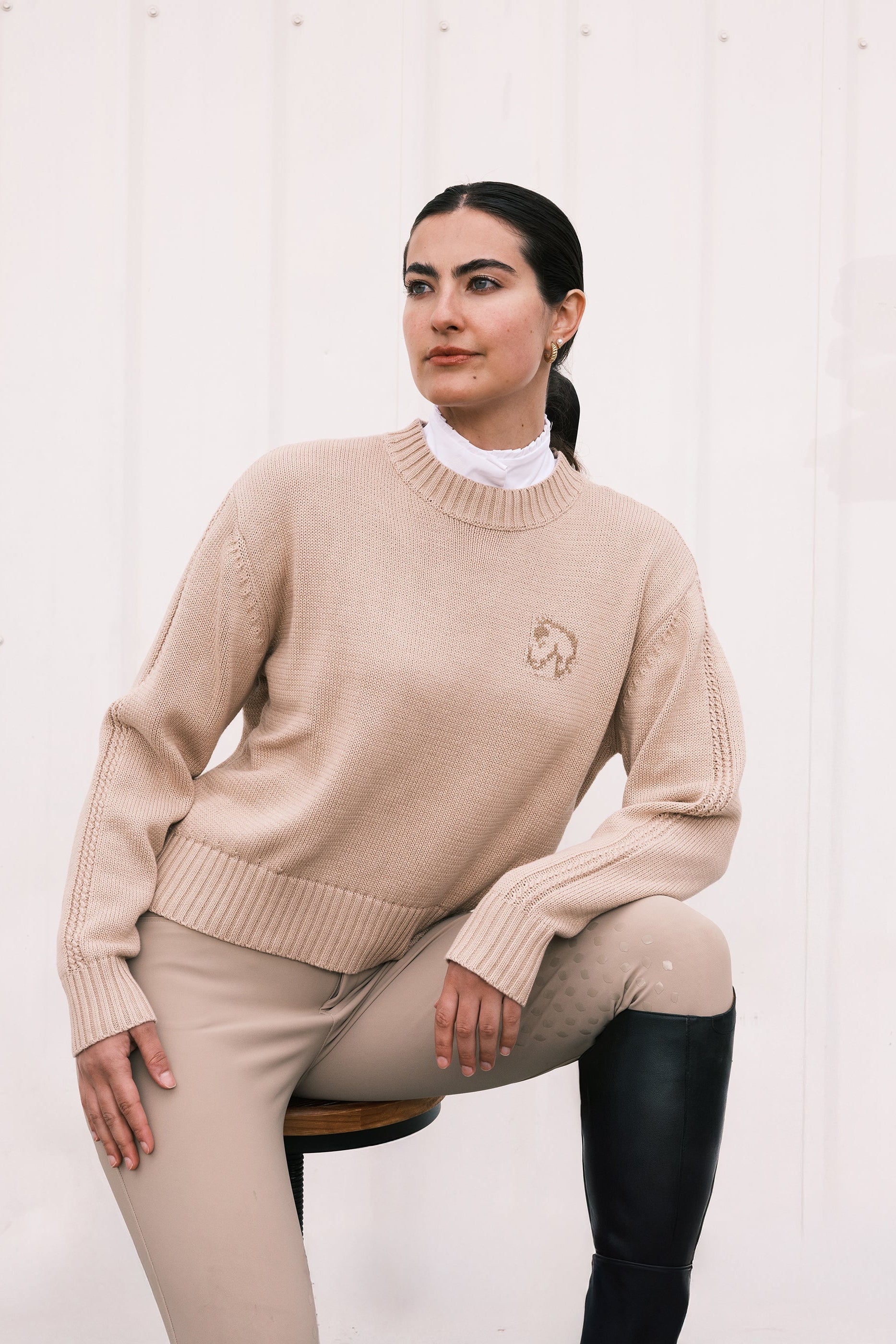 Lightweight, breathable, and perfect for cool summer nights. The Margot Sweater is spun from a soft cotton blend and finished with a tonal 2" horse head embroidery on the chest. A braided stitch runs down the sleeves for a subtle, tactile detail that feels equal parts cozy and elevated, and nods to our equestrian heritage roots.