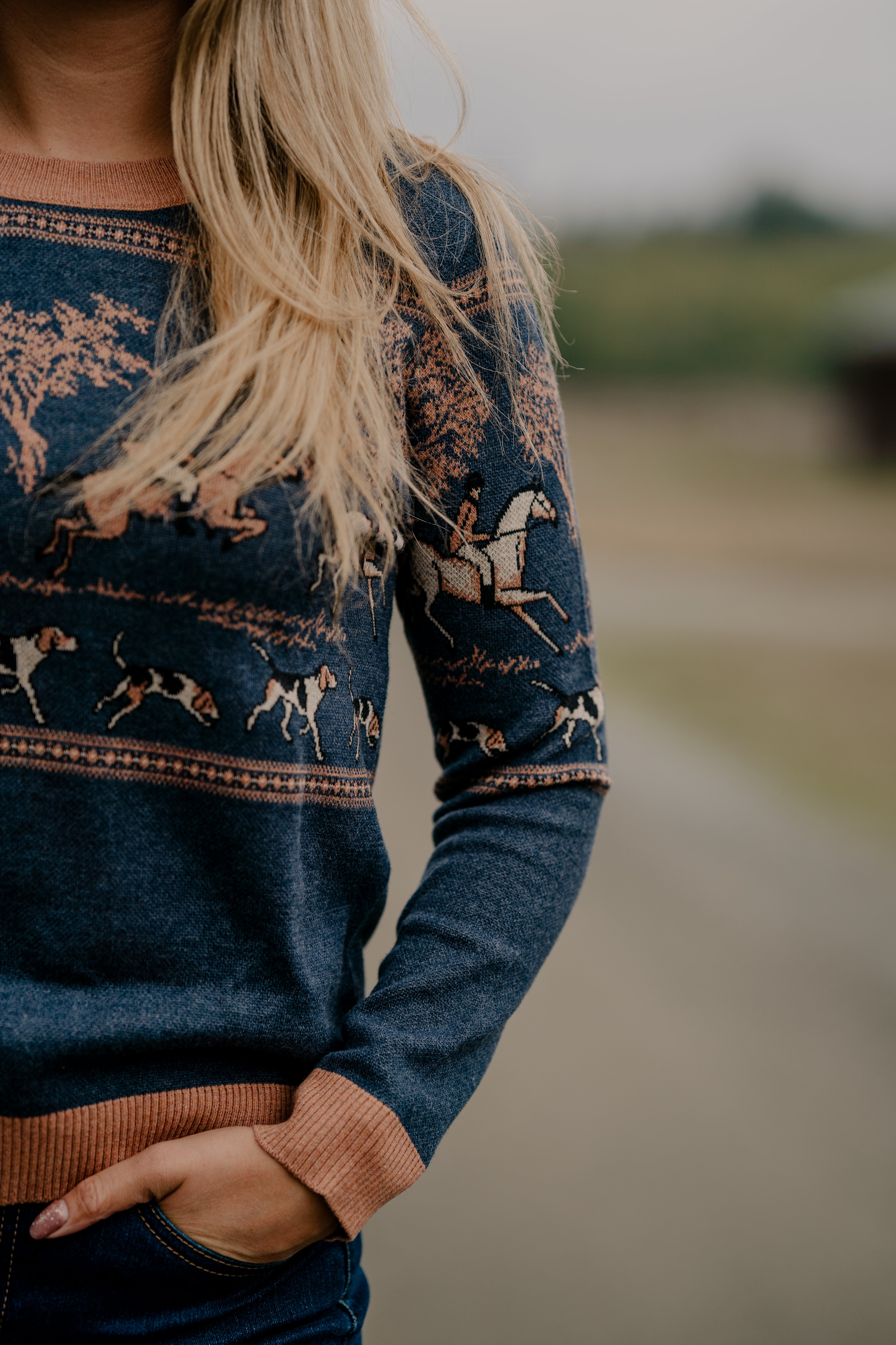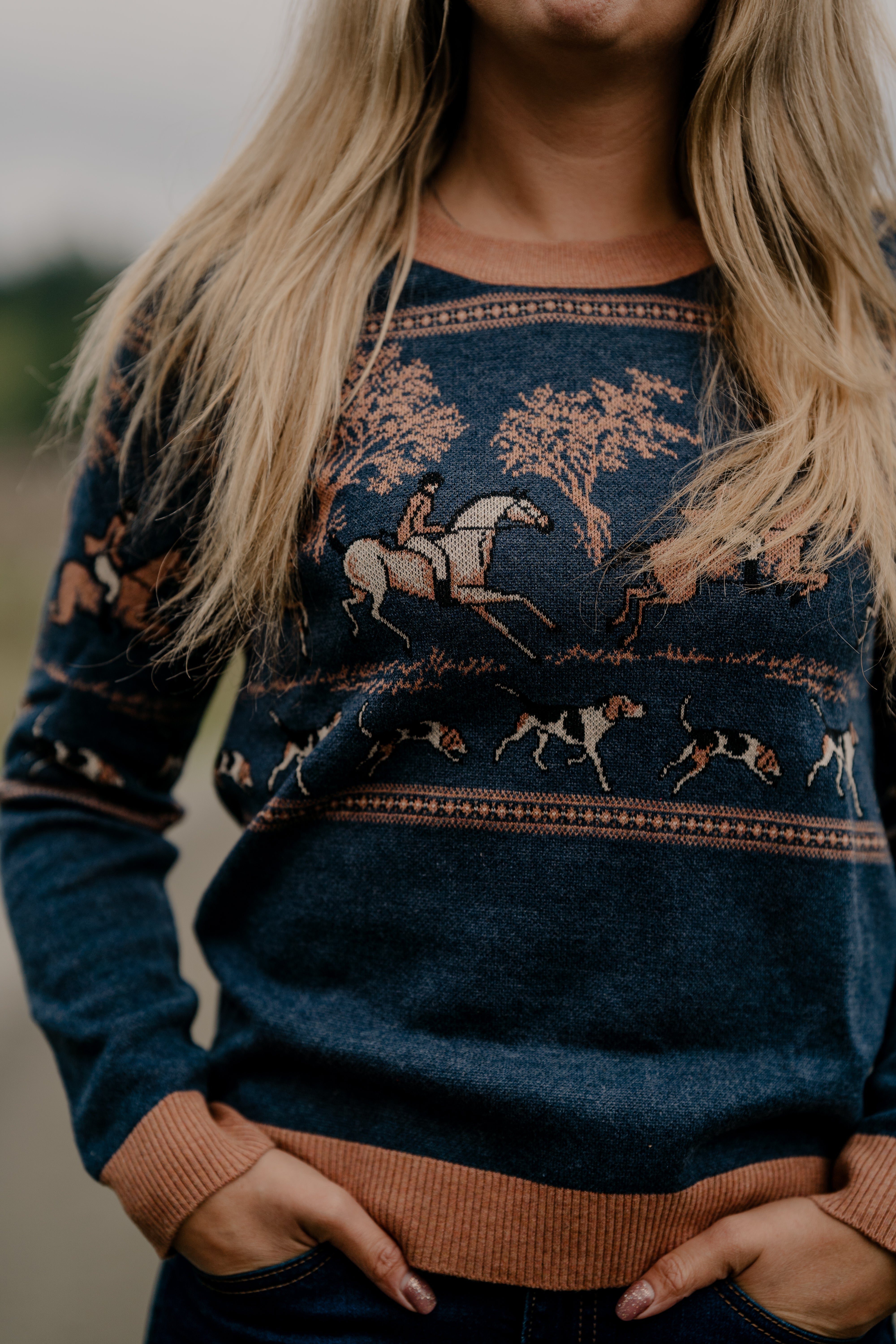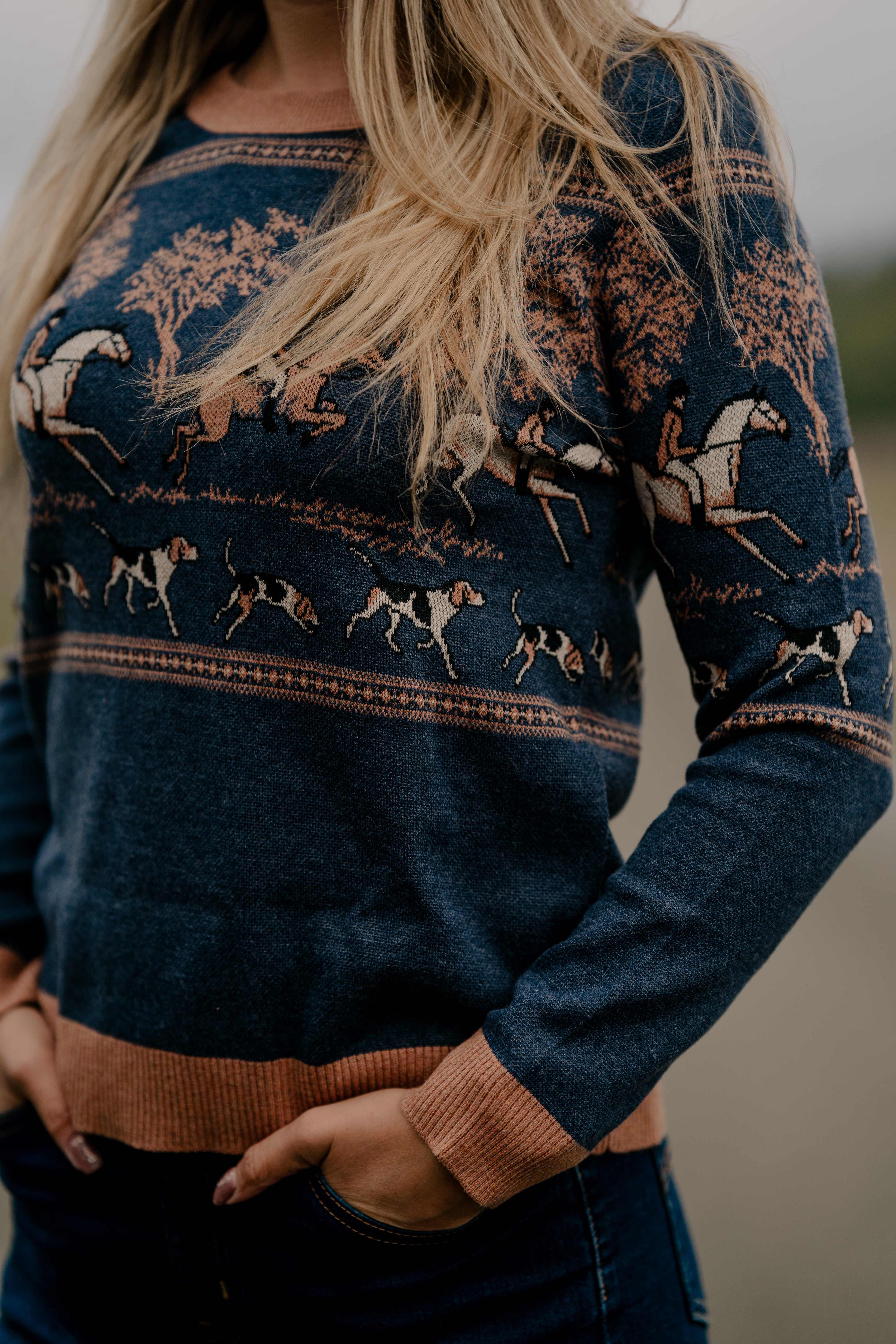 Crafted with the utmost care and attention to detail, the sweater features a serene landscape adorned with majestic horses, towering trees, and spirited hounds, all intricately woven into the fabric.