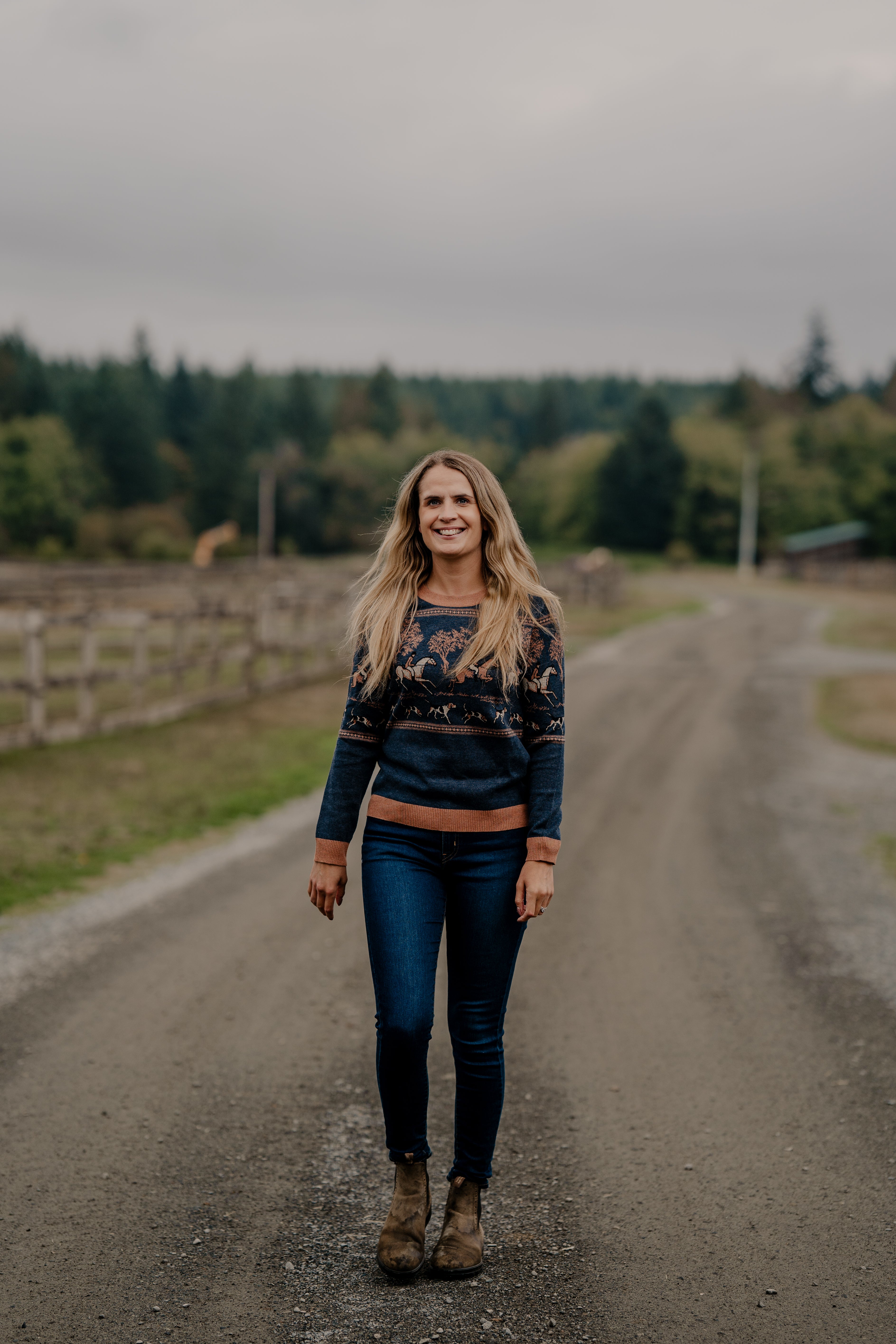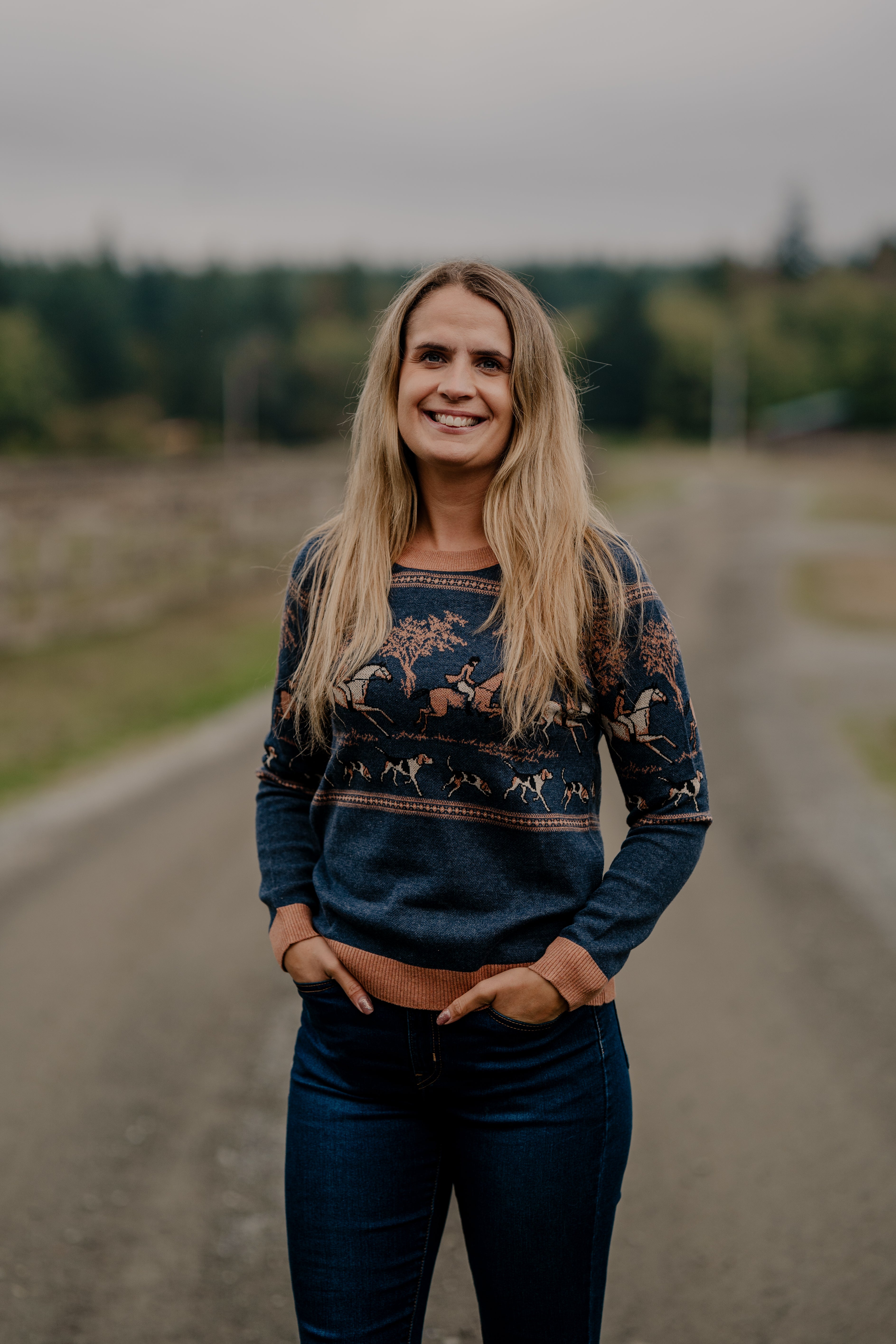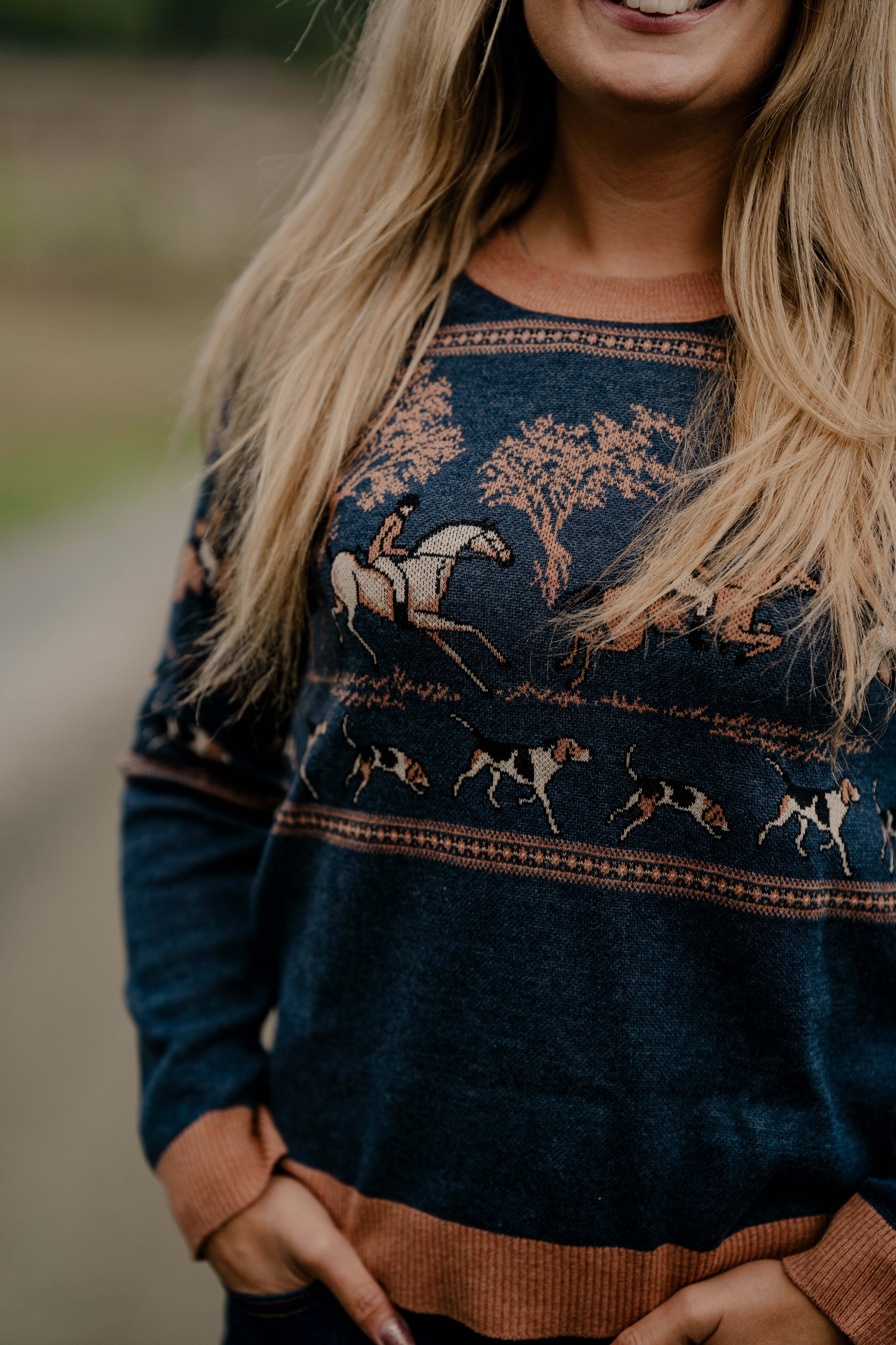 Crafted with the utmost care and attention to detail, the sweater features a serene landscape adorned with majestic horses, towering trees, and spirited hounds, all intricately woven into the fabric.