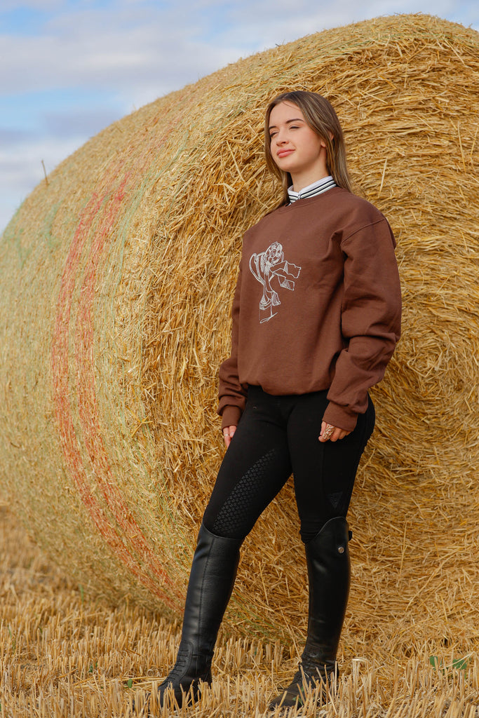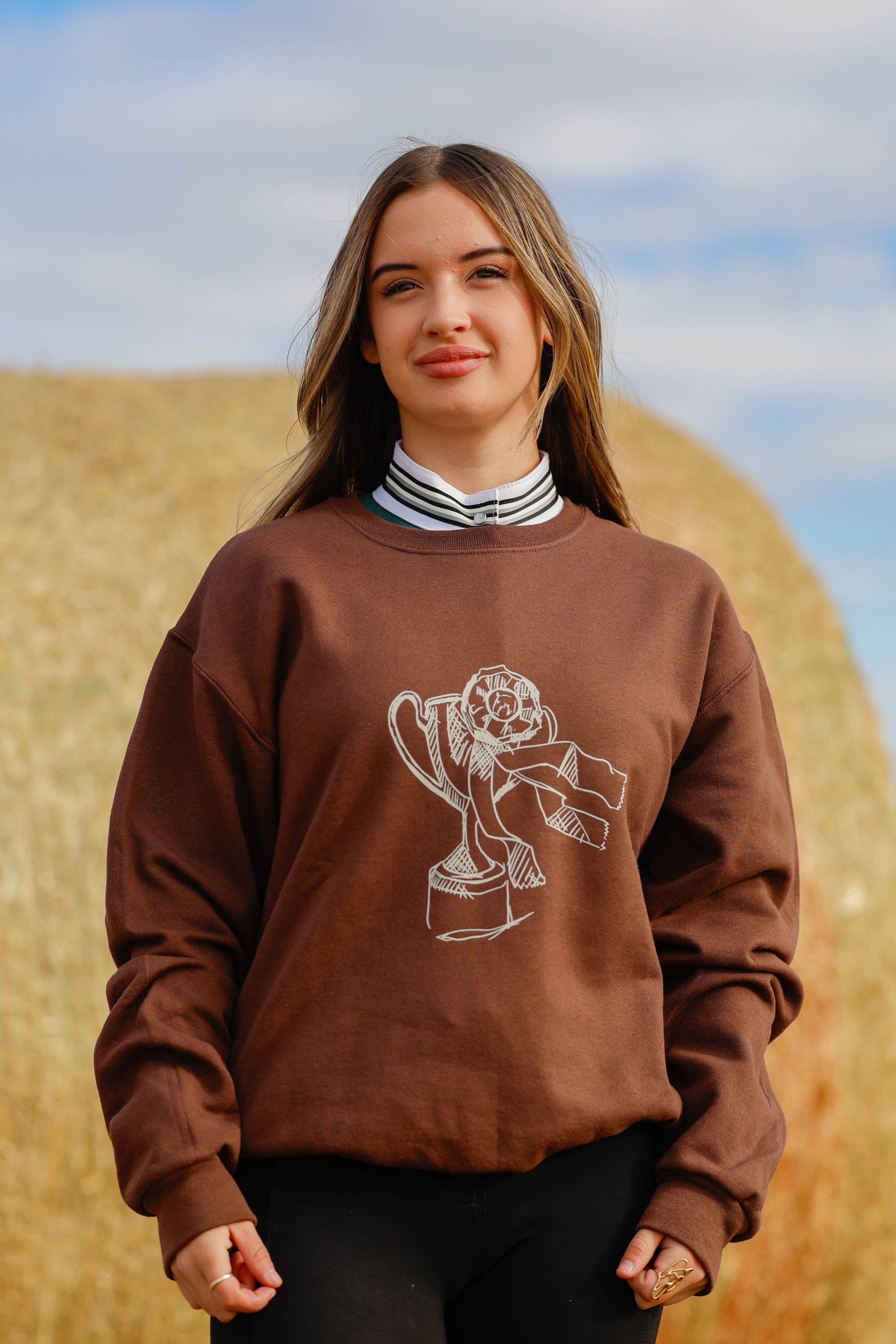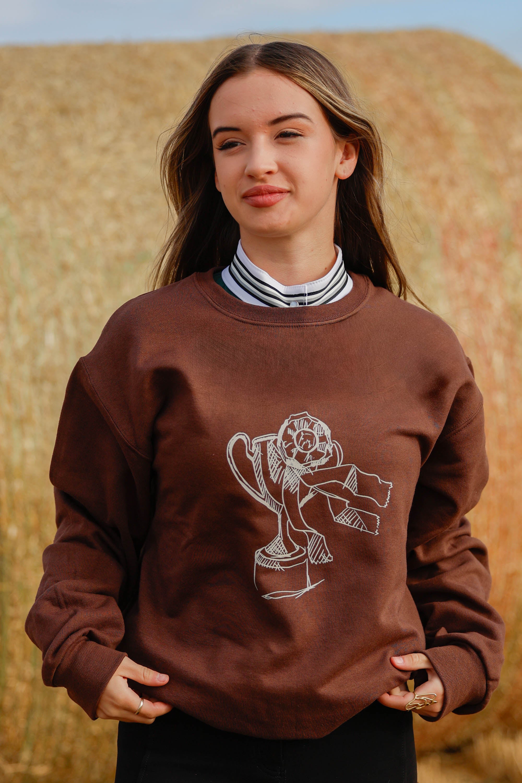 Crafted in a rich saddle brown hue that flatters every rider, this cozy crewneck is an ode to the moments that make it all worth it: early mornings, polished boots, perfect distances, and the sweet sound of your number being called. The minimalist line-art trophy and rosette design by Canadian artist Lavender Woodman captures the essence of quiet confidence — because true champions let their ride speak for itself.
